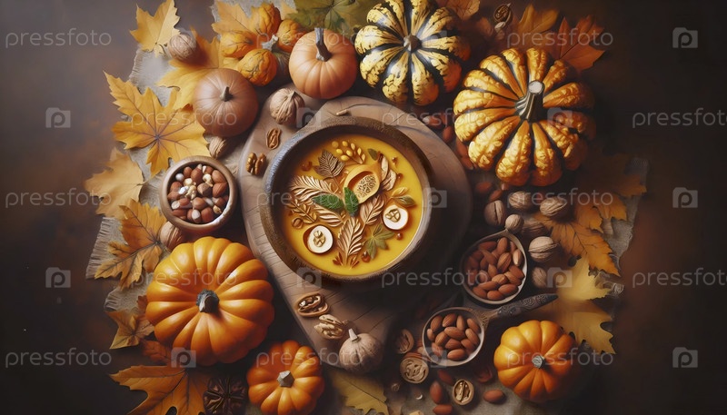 Сезонное осеннее кулинарное искусство с миской для тыквенного супа, окруженной резанными овощными листьями и жареными орехами, Ai created image