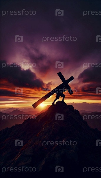 Силуэт фигуры, несущей крест на закате солнца, Ай создал изображение