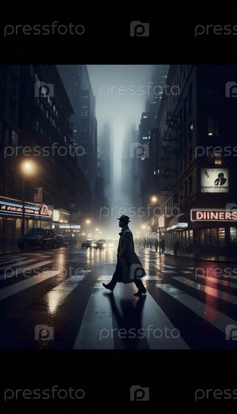 Одинокая фигура, пересекающая пролитый дождем перекресток в Нью-Йорке 1970-х годов, Ai generated image