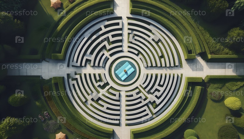 Вид с воздуха на круглый каменный лабиринт с матом йоги в центре, Ai created image