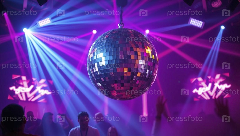 Сцена в ночном клубе с одним гигантским дискотечным шаром, отражающим красочные лазерные лучи во всех направлениях, Ai generated image