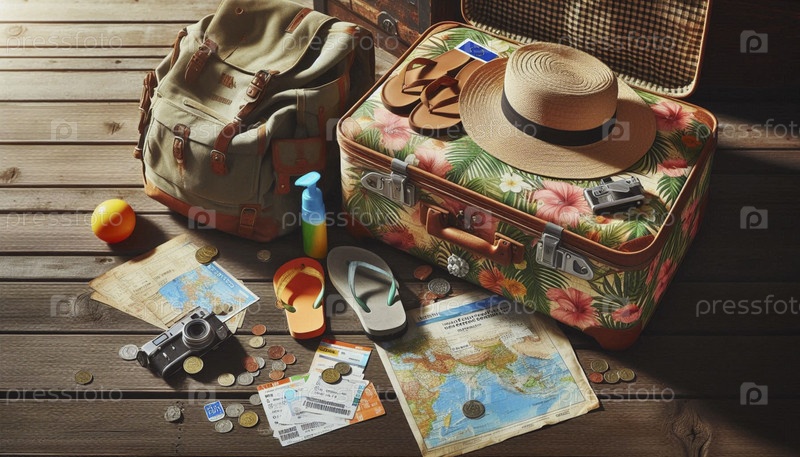Товары для путешествий, включая багаж, паспорт и билеты на место назначения, Ai generated image