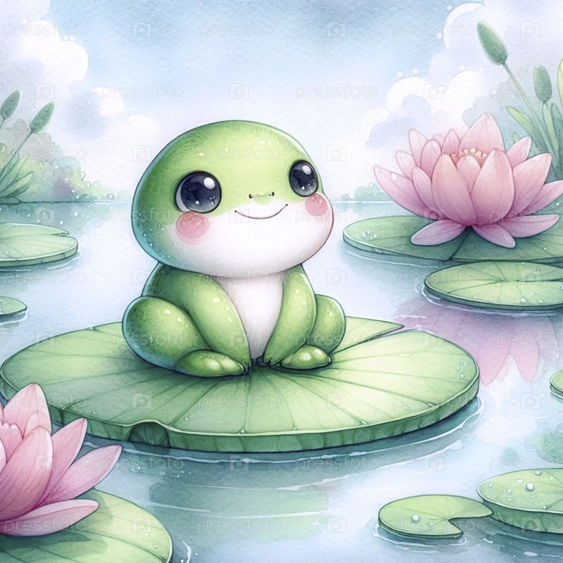 Кавайская сцена лягушки на подложке лилии, Ai generated image