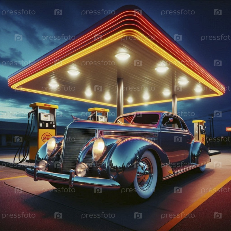 Фиолетовый 1957 Бел Эйр припаркован на старой заправочной станции со светящимися неоновыми знаками, Ai generated image
