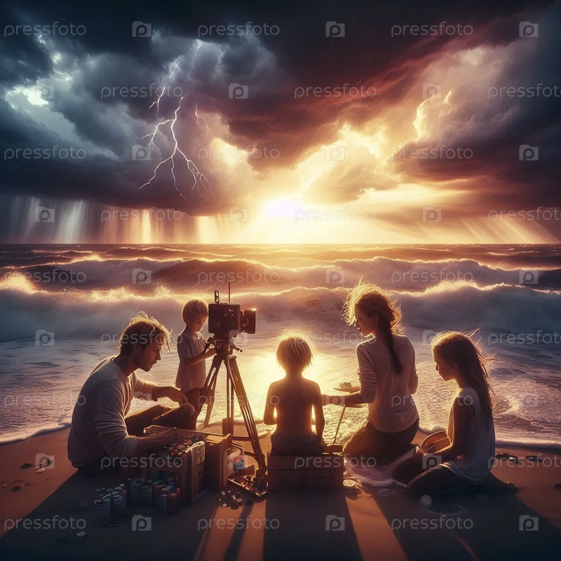 Молодая семья строит песчаный замок вместе на раздуваемом ветром пляже в конце бурного дня, драматическое просветление неба позади них