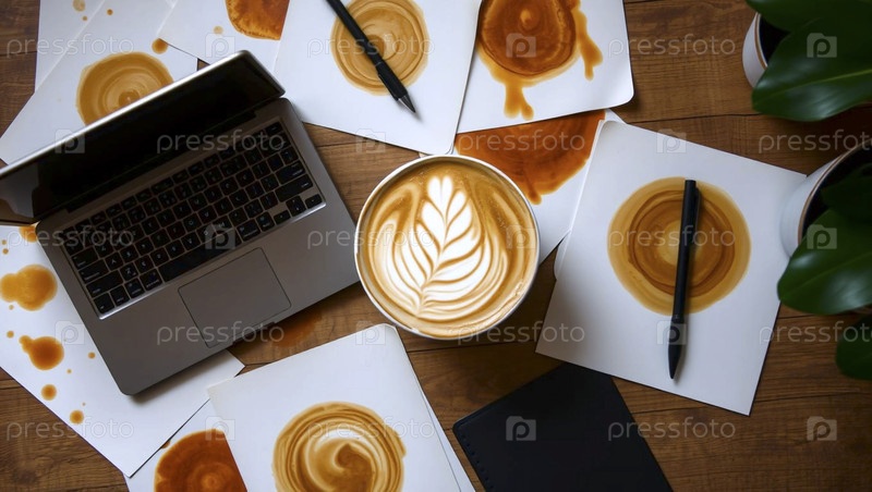 Искусство, ноутбук с чашкой кофе, Ai generated image Lat