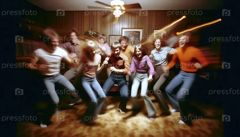 Спонтанная танцевальная вечеринка в гостиной, родители и дети танцуют под музыку пластинки с флэшем, захватывающий момент, Ai создал изображение