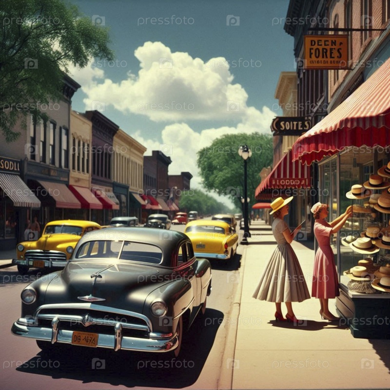 Живая сцена на главной улице США, с парой модных витрин 1950-х годов для покупок под полосатыми тентами, Ai generated image