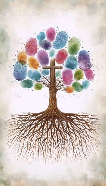 Семейное дерево бохо с листьями отпечатков пальцев и перекрестным корнем, Ai generated image