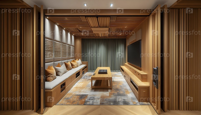 Скрытый домашний кинотеатр, раскрытый скользящими деревянными панелями, Ai created image