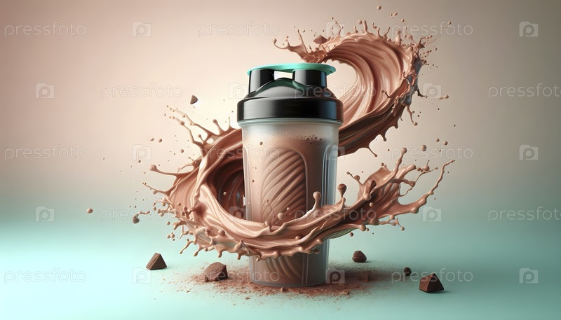 Изолированная прозрачная бутылка для шейкеров с вращающимся шоколадным белковым напитком, Ai created image