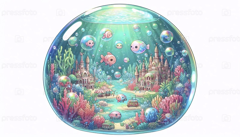 Подробная иллюстрация кавайи подводного города в пузыре, Ai generated image