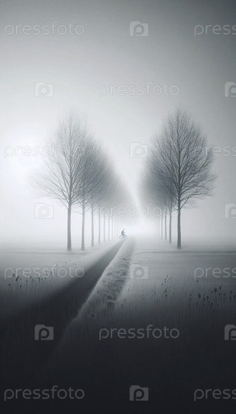 Одинокий велосипедист, катающийся на велосипеде в раннем утреннем тумане в обширном пустом парке, Ай создал изображение