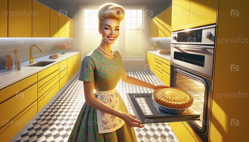 Безупречная кухня 1960-х годов с лимонно-желтыми приборами, улыбающаяся домохозяйка, кладящая пирог в современную духовку, Ai generated image