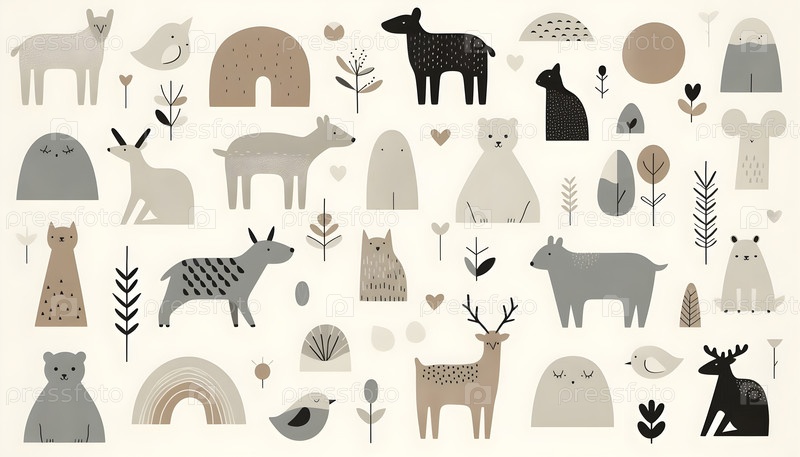 Скандинавские минималистические силуэты животных детская комната обои, Ai created image