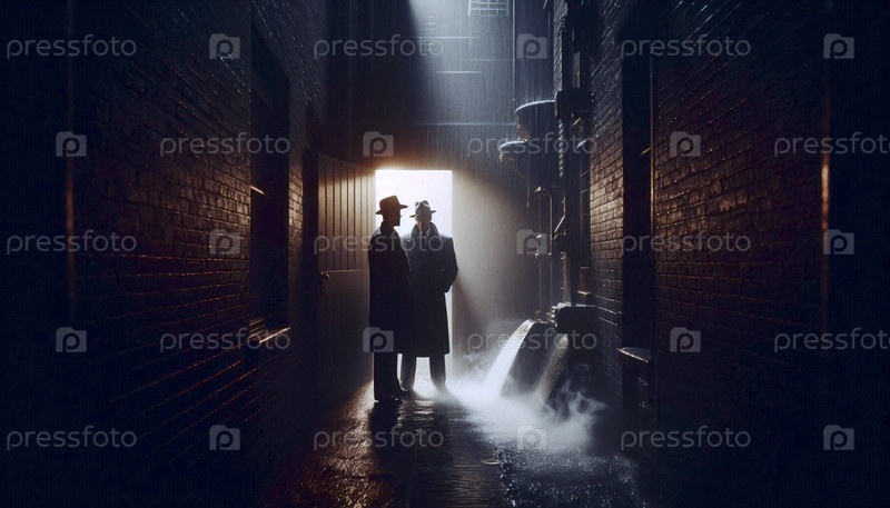 Секретный разговор между двумя мужчинами в шляпах, их лица скрыты под тентом мокрой аллеи, создал изображение Ай