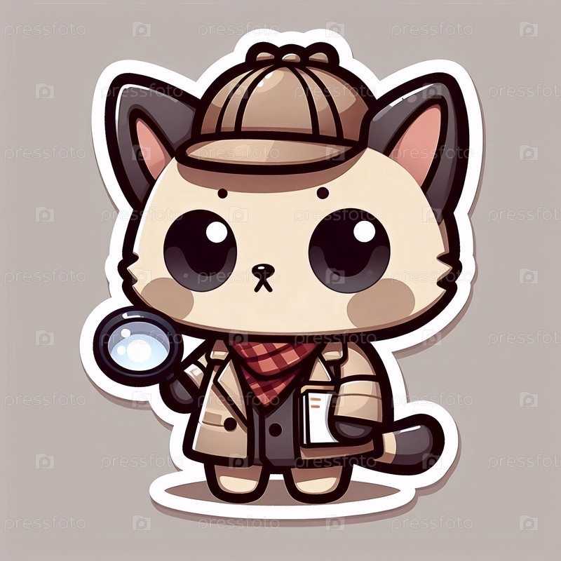 Милый стикер кавайского детектива чиби-кошки, Ai generated image
