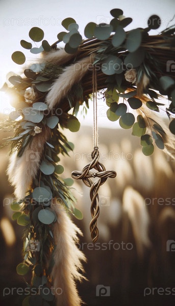 Декор свадебной елки с эвкалиптом, сушеными цветами и подвесным крестом, Ai generated image