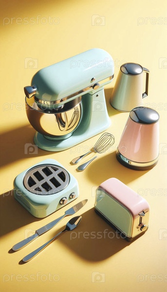 Коллекция пастельных кухонных приборов, расположенная на желтой столешнице, Ai generated image