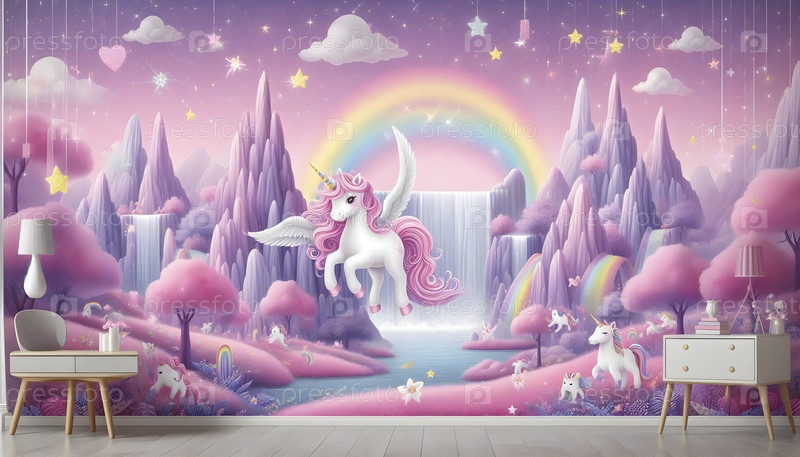 Magical unicorn kingdom детская комната обои с радужными водопадами и блестящей звездой , Ai created image