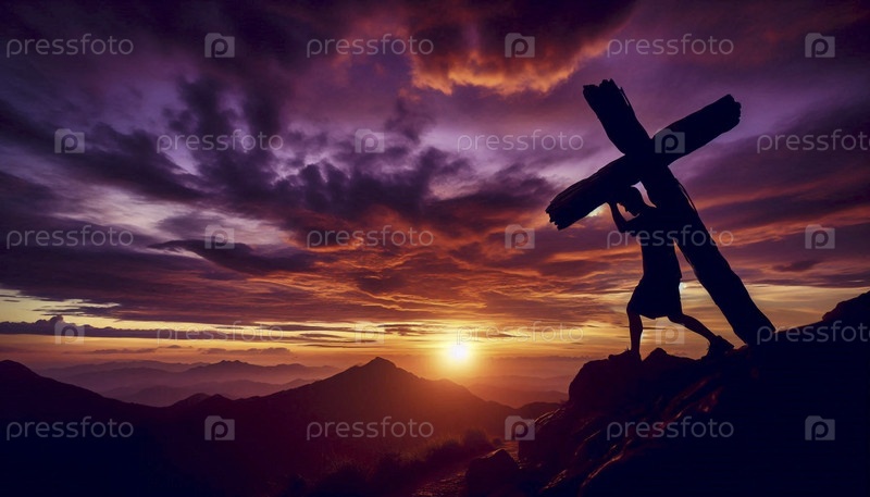 Силуэт фигуры, несущей крест на закате солнца, Ай создал изображение