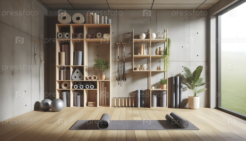 Минималистическая студия йоги с прокатными коврами, роликами из пены и лентами сопротивления, Ai created image