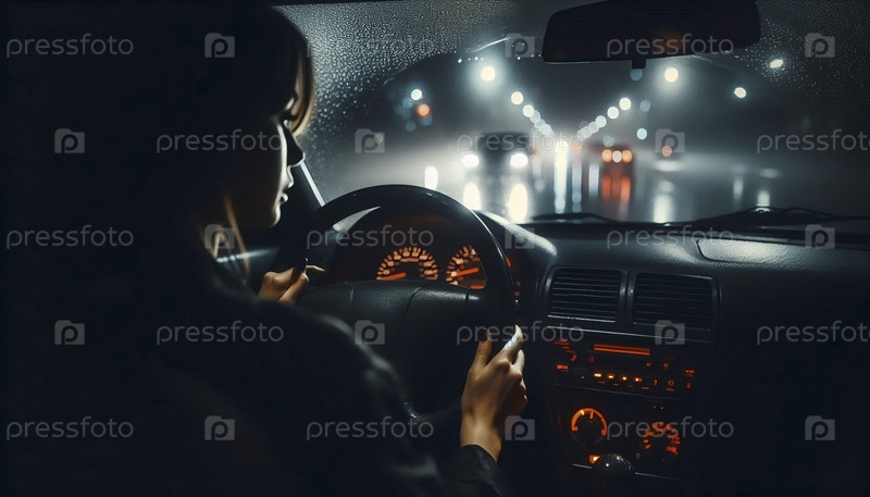 Кинографический кадр женской руки, опирающейся на рулевое колесо, ее лица в тени, наблюдая за дождевыми полосами по лобовому стеклу, Ай создал изображение