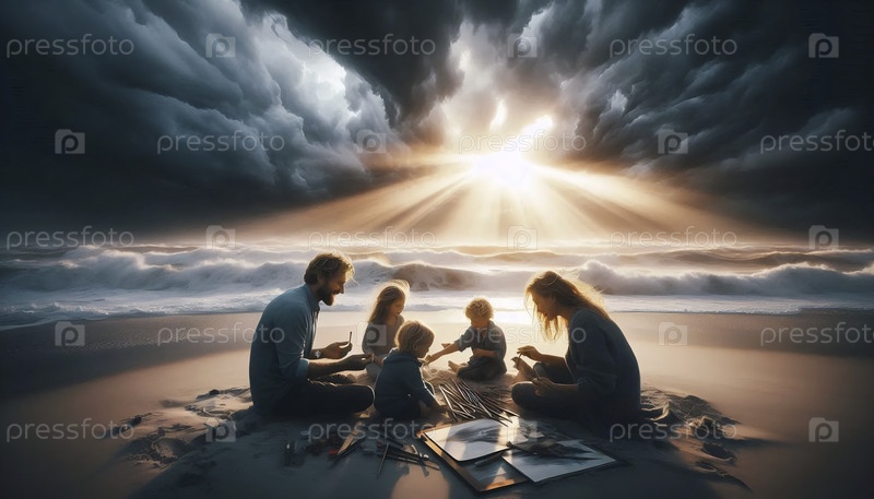 Молодая семья строит песчаный замок вместе на раздуваемом ветром пляже в конце бурного дня, драматическое просветление неба позади них