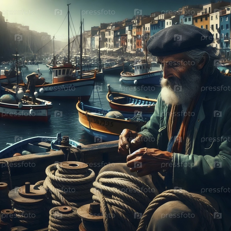 Старый матрос, исправляющий рыболовные сети на ветреной деревянной палубе своей лодки в оживленной средиземноморской гавани, Ай создал изображение