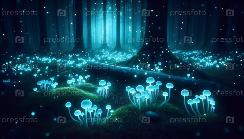 Светящийся биолюминесцентный кластер грибов, Ai generated image