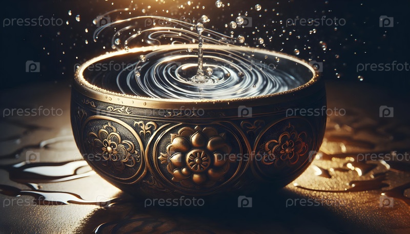 Тибетская певческая чаша, вибрирующая капельками воды, Ai created image