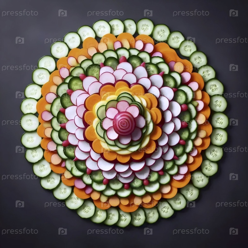 Красочная растительная мандала, созданная из тонко нарезанных редисок, огурцов и морковь, Ai created image