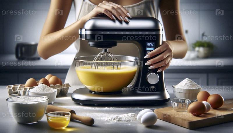 Близкий снимок сверху вниз рук женщины, использующей новый электрический миксер в искрящейся желтой тарелке с ингредиентами, идеально предварительно измеренных в стеклянных чашках