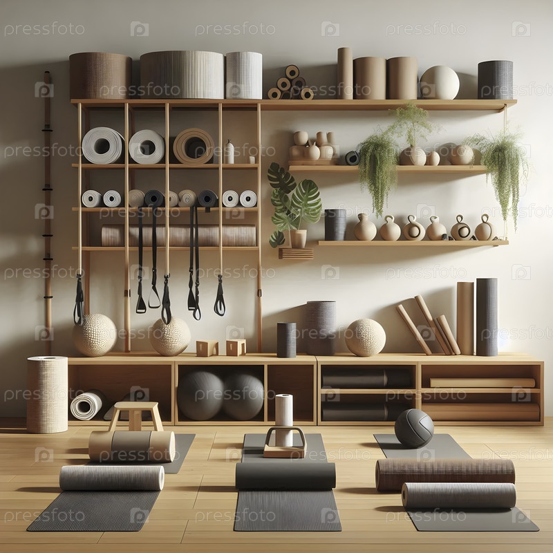 Минималистическая студия йоги с прокатными коврами, роликами из пены и лентами сопротивления, Ai created image