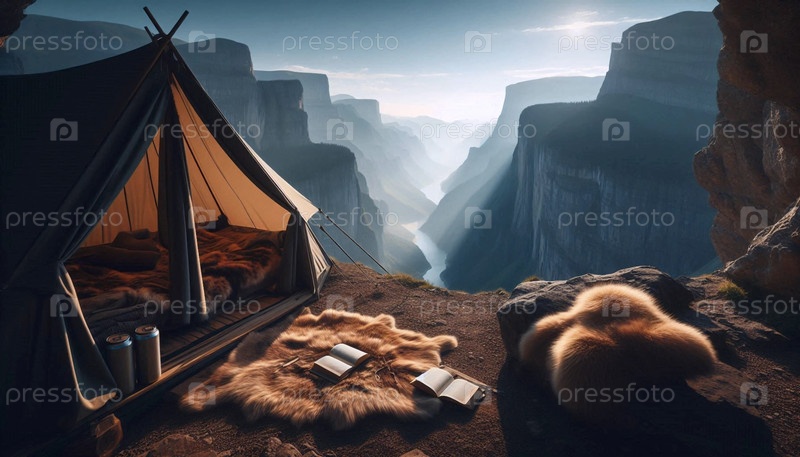 Палатка на вершине скалы с видом на горы, Ai generated image