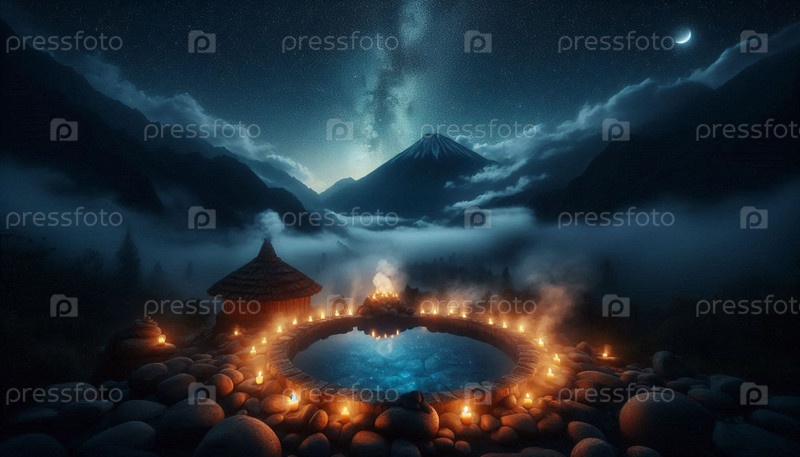 Скрытый горный горячий источник ночью, Ai generated image