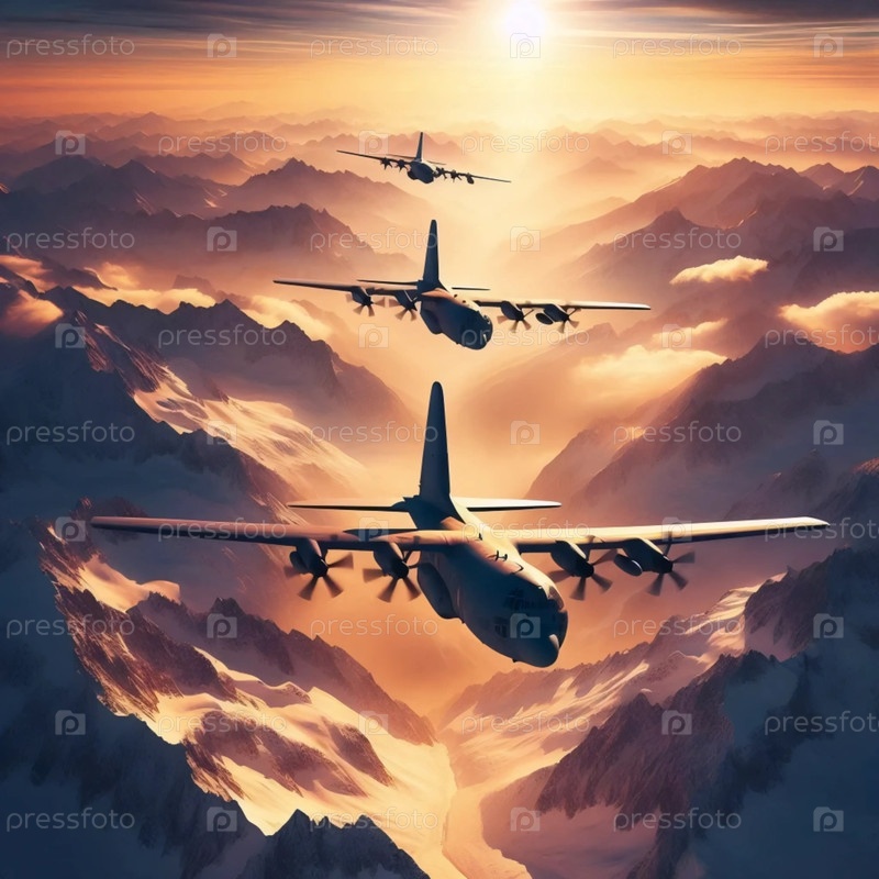 Формирование военно-транспортных самолетов, летящих над горами, Ai generated image