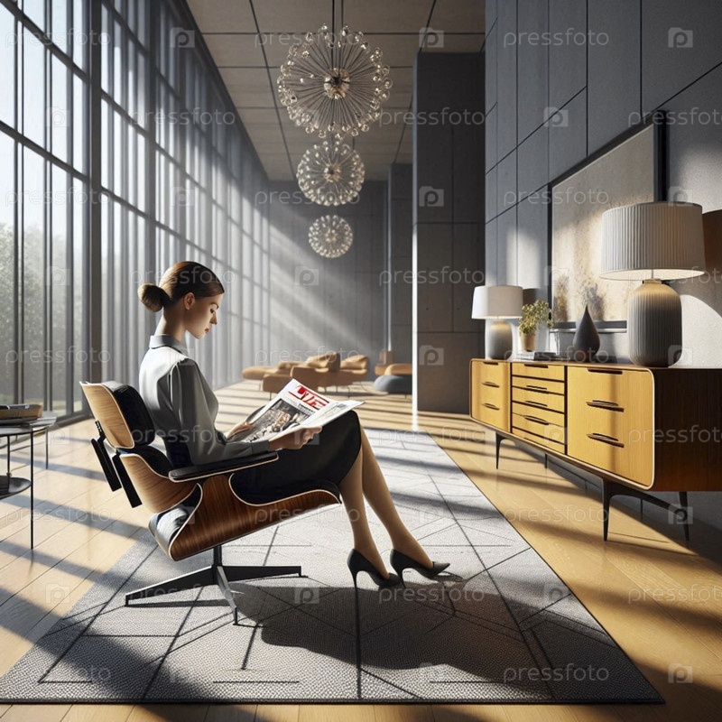 Яркая современная гостиная середины века с женщиной, читающей журнал у панорамного окна, Ai generated image