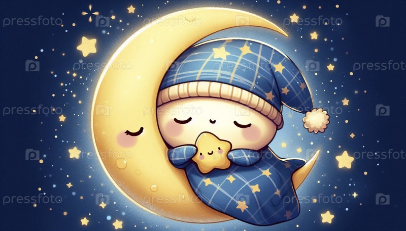 Сонная кавайская луна с ночной чашечкой, Ai generated image