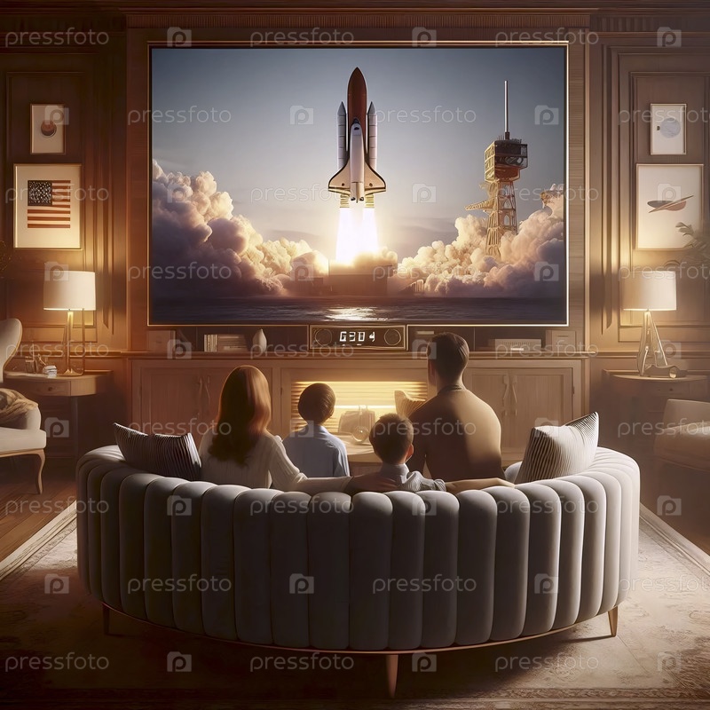 Семья собралась вокруг большого цветного телевизора в консольном стиле, наблюдая за запуском космического аппарата с выражениями благоговения