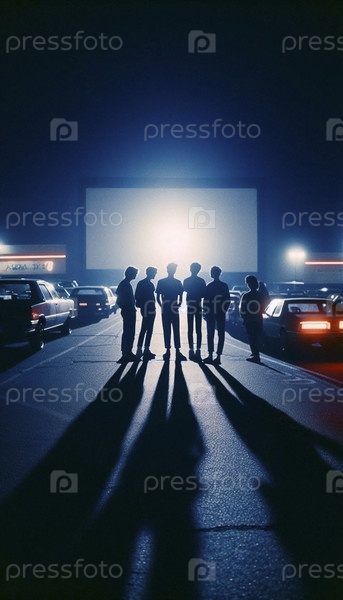 Группа друзей, сидящих на капоте автомобиля и слушающих музыку из бумбокса в драйв-ин-кинотеатре, Ai generated image