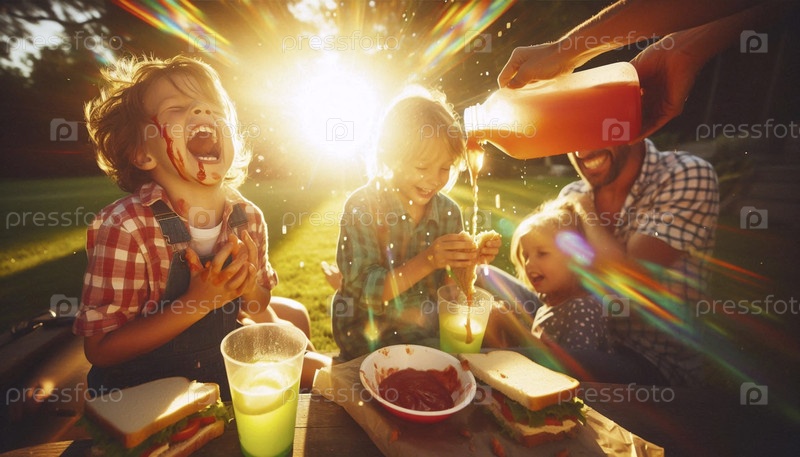 Хаотичный и радостный семейный пикник на квадратном одеяле во дворе 1970-х годов, Ай создал изображение