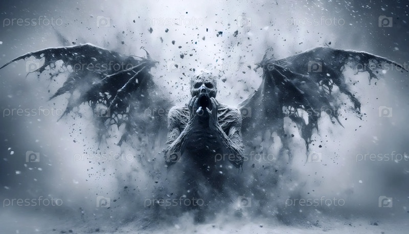 Скелетный ангел с крыльями, съеденными молью в заброшенной церкви, Ai generated image