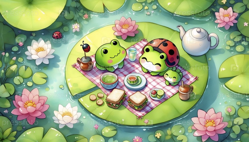 Кавайская сцена пикника на лилии, Ai generated image