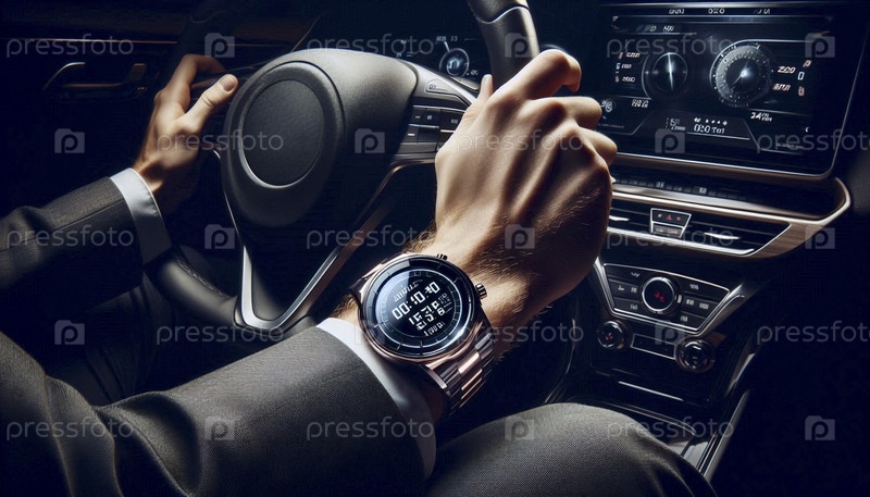 Близкий план запястья мужчины, носящего изысканные, новые электрические наручные часы с цифровым показателем, его рука опирается на руль современного автомобиля
