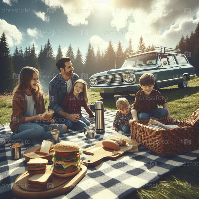 Веселый семейный пикник рядом со своим деревянным универсалом в национальном парке, Ai generated image