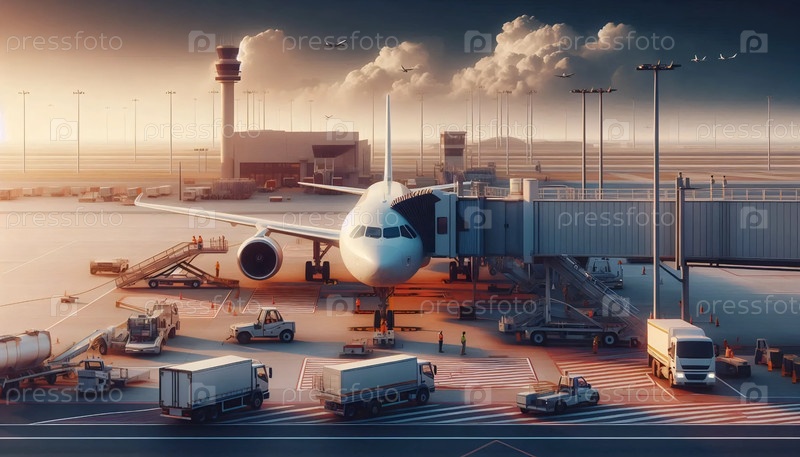 Самолет у ворот с реактивным мостом и транспортными средствами наземного обслуживания, Ай создал изображение