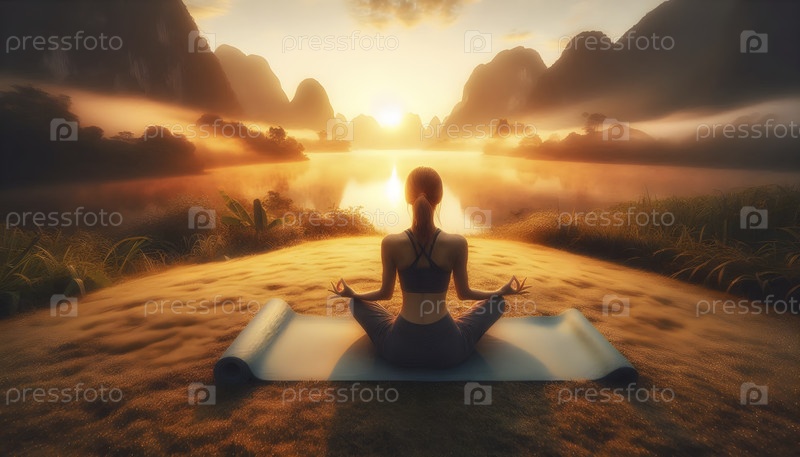 На рассвете йога-матка на розовой траве с видом на туманные горы, Ai created image