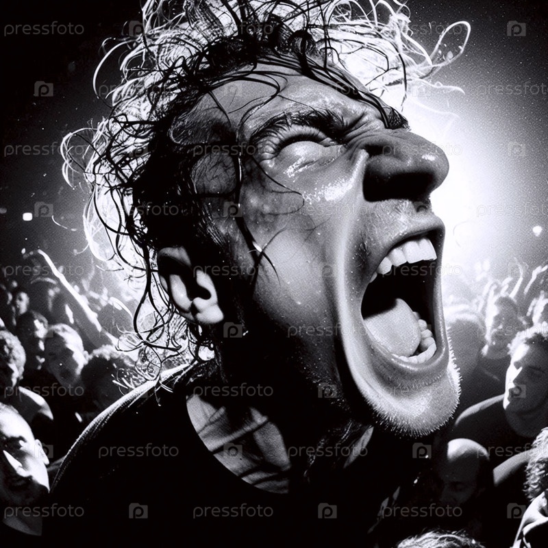 Интенсивное, кричащее лицо вокалиста хэви-металла, опухшие вены, захваченные в середине выступления вспышкой, Ай создали образ