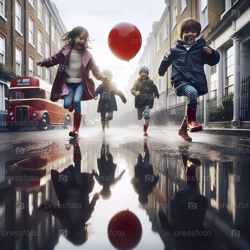 Динамичная уличная сцена детей, преследующих воздушный шар через лужайку в Лондоне 1960-х годов, Ai generated image